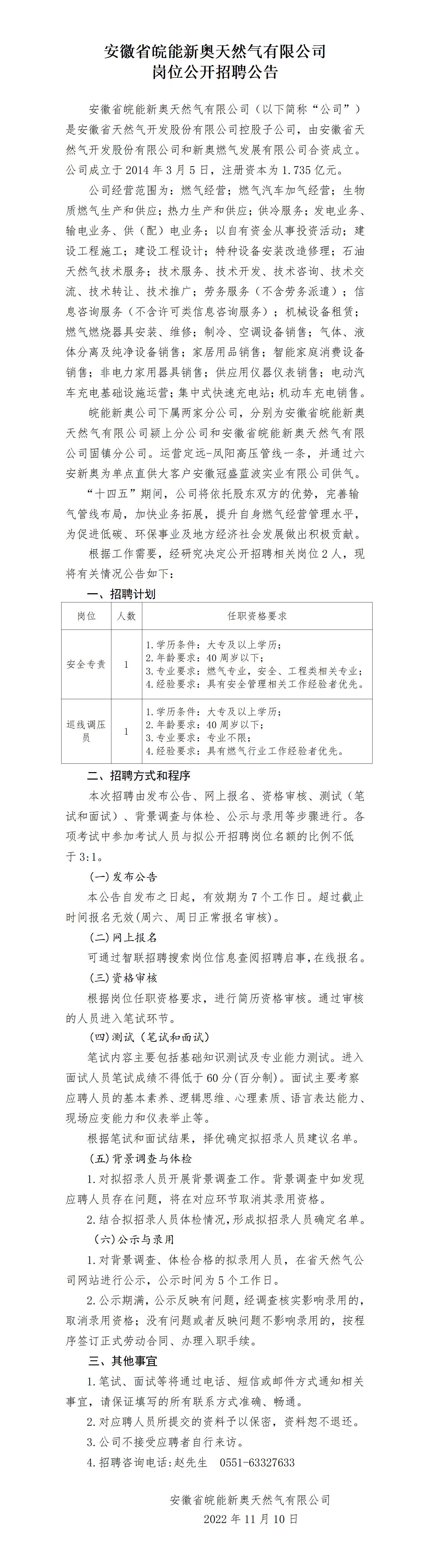2022年安徽省皖能新奥天然气有限公司岗位公开招聘公告