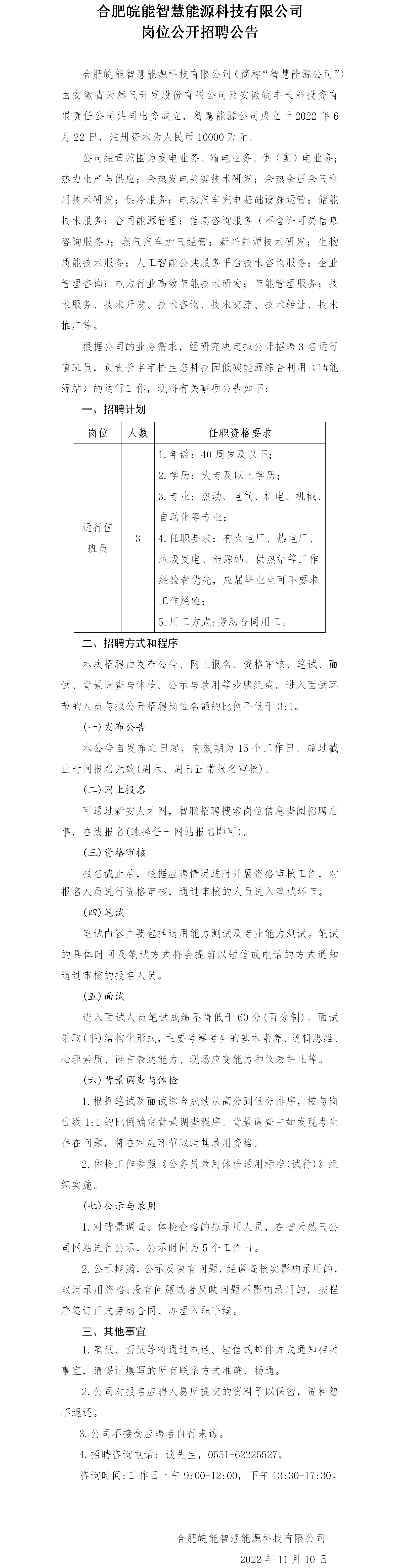 2022年合肥皖能智慧能源科技有限公司岗位公开招聘公告