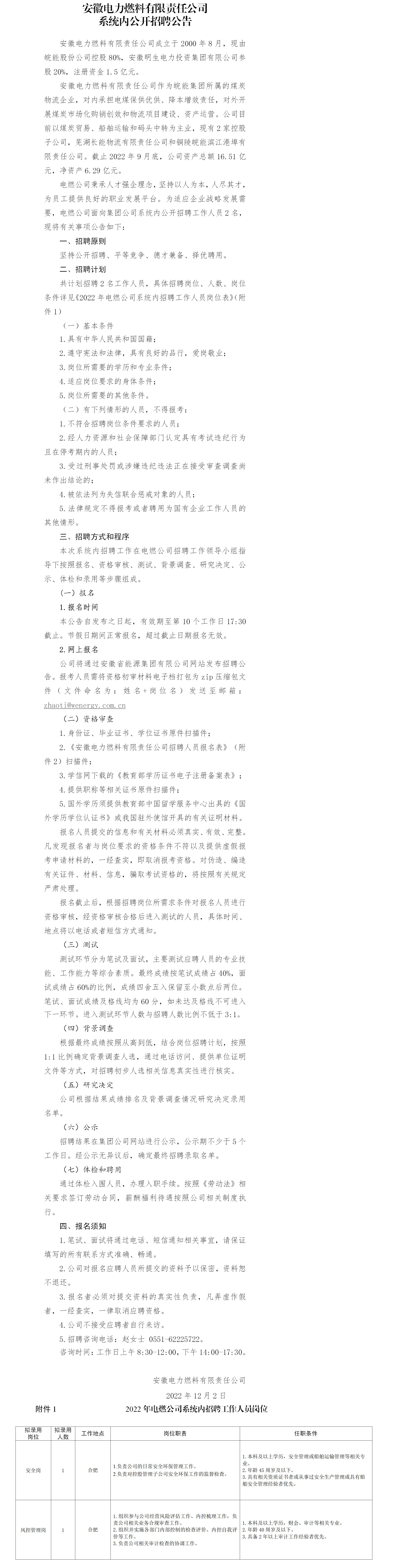 2022年安徽电力燃料有限责任公司系统内公开招聘公告
