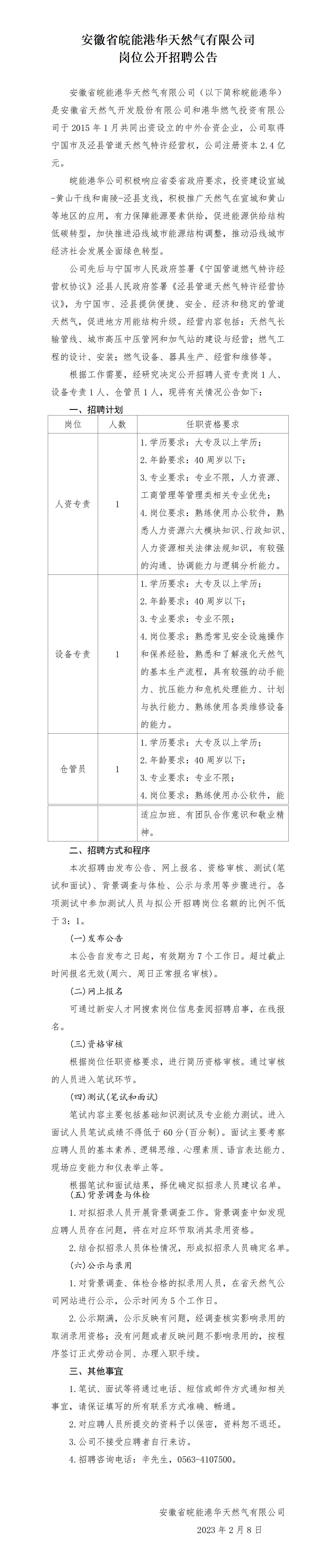2023年安徽省皖能港华天然气有限公司岗位公开招聘公告