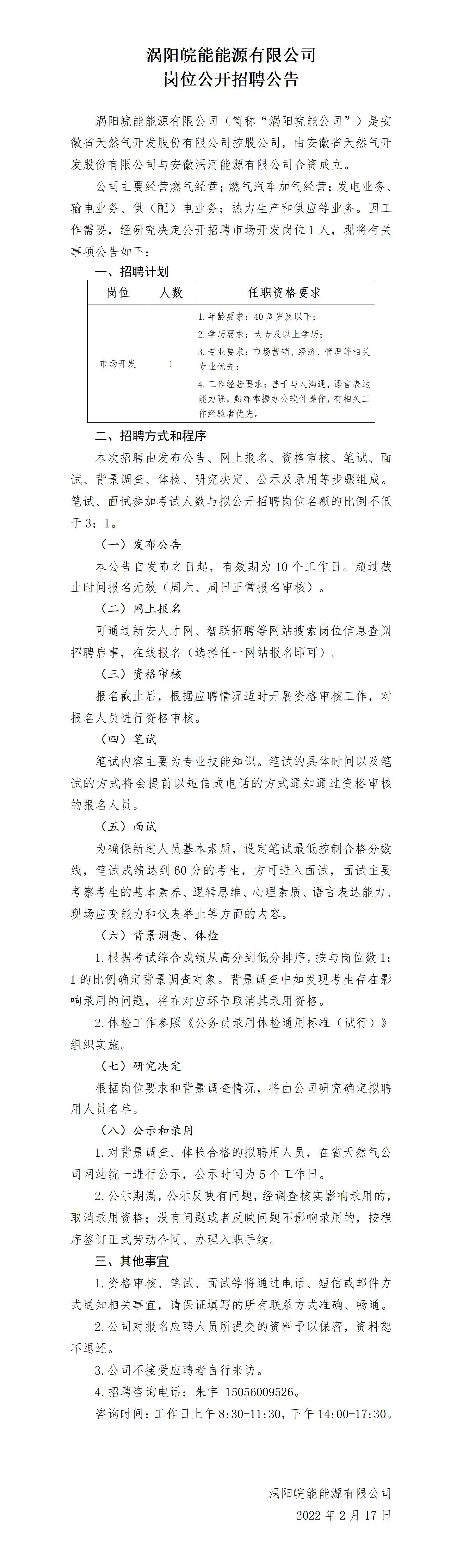 2023年亳州涡阳皖能能源有限公司岗位公开招聘公告