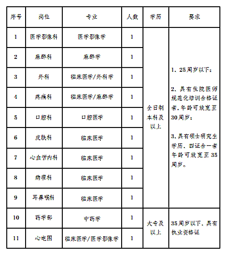 现根据医院业务发展的需要,面向社会公开招聘以下专业技术人才,具体公告如下: