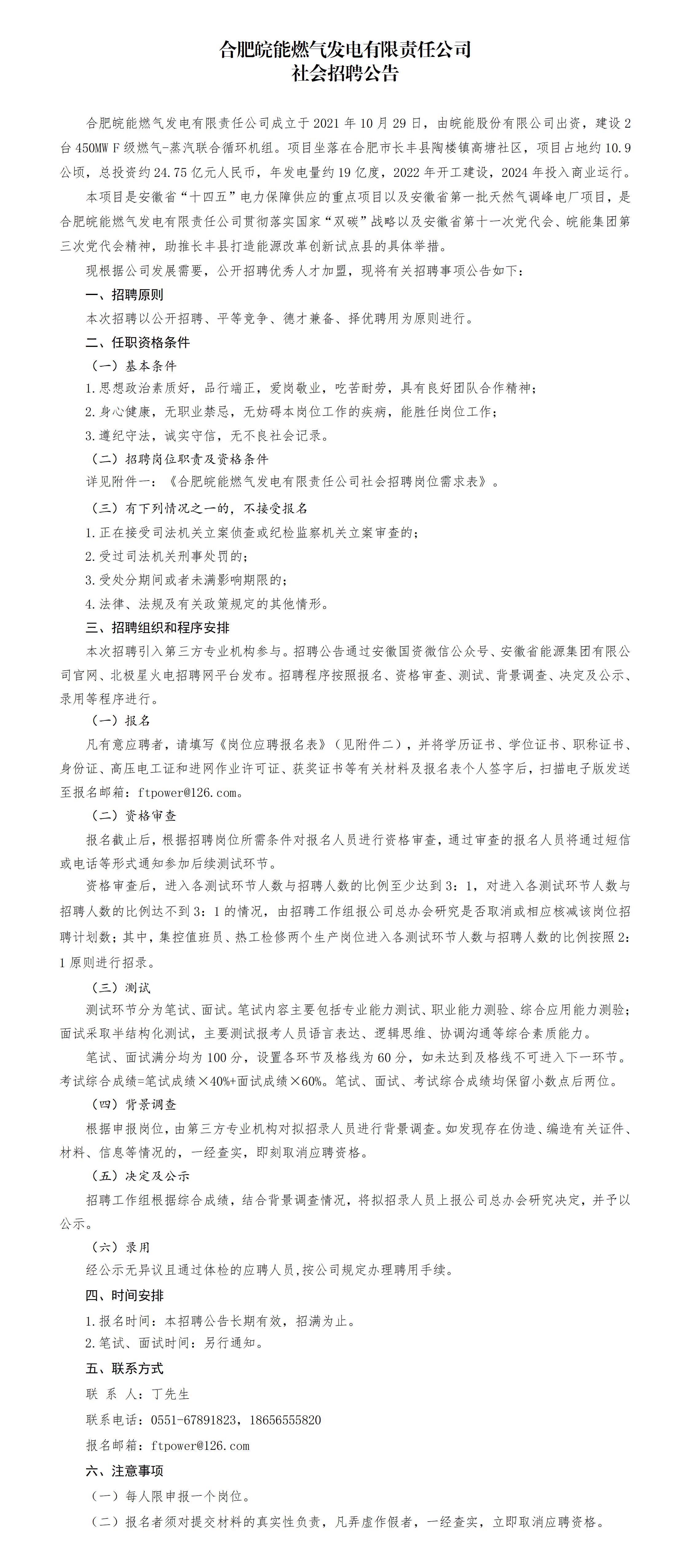 详见附件一:《合肥皖能燃气发电有限责任公司社会招聘岗位需求表》。