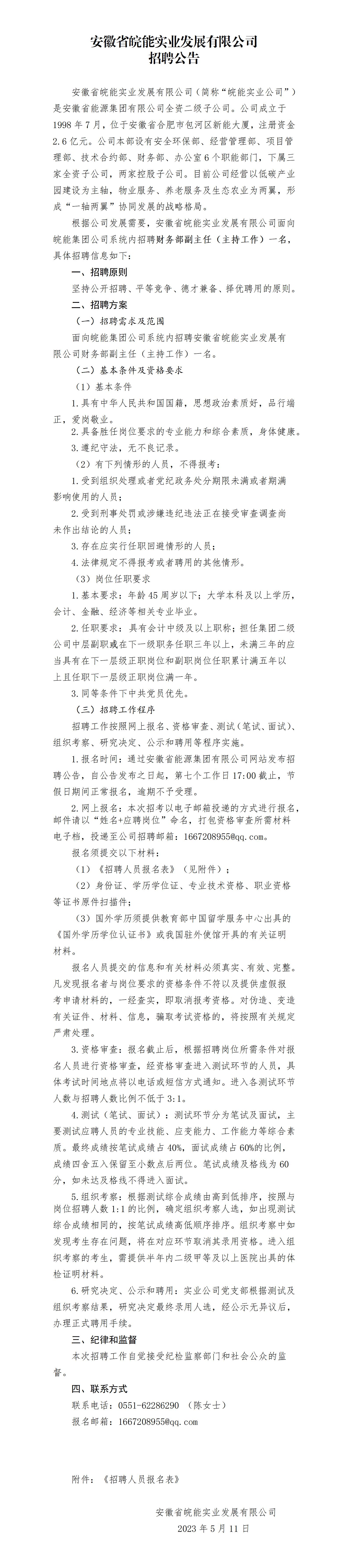 面向皖能集团公司系统内招聘安徽省皖能实业发展有限公司财务部副主任(主持工作)一名。
