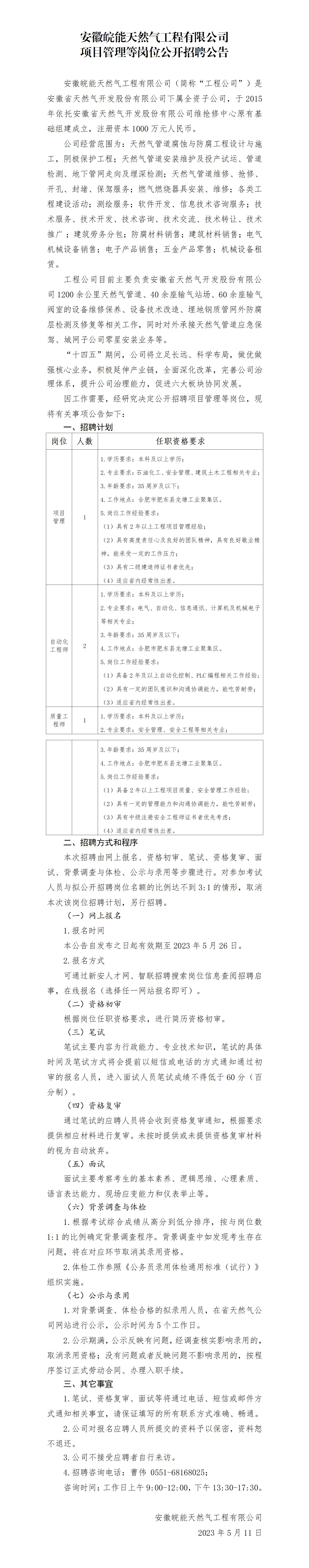 2023年安徽皖能天然气工程有限公司项目管理等岗位公开招聘公告