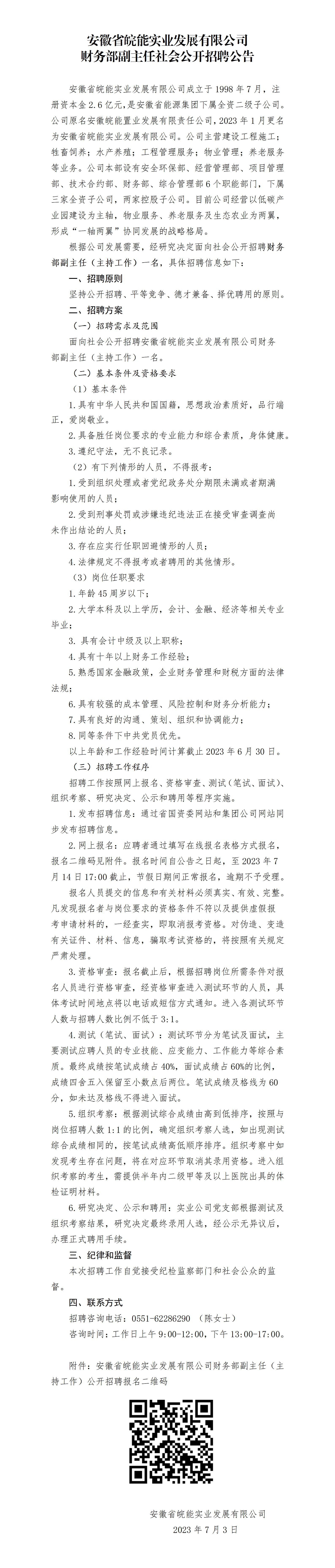面向社会公开招聘安徽省皖能实业发展有限公司财务部副主任(主持工作)一名。