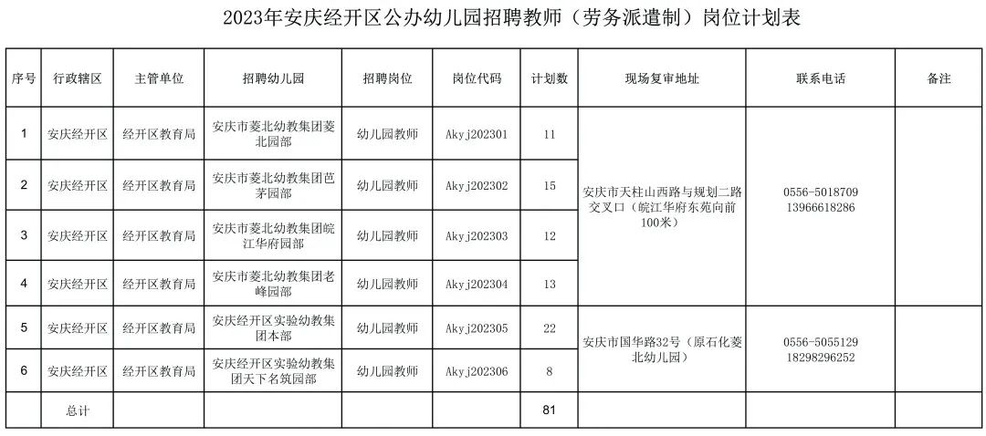 2023年安庆经开区公开招聘公办幼儿园劳务派遣制教师81名,具体岗位见《2023年安庆经开区公办幼儿园招聘教师(劳务派遣制)岗位计划表》(附件1)。