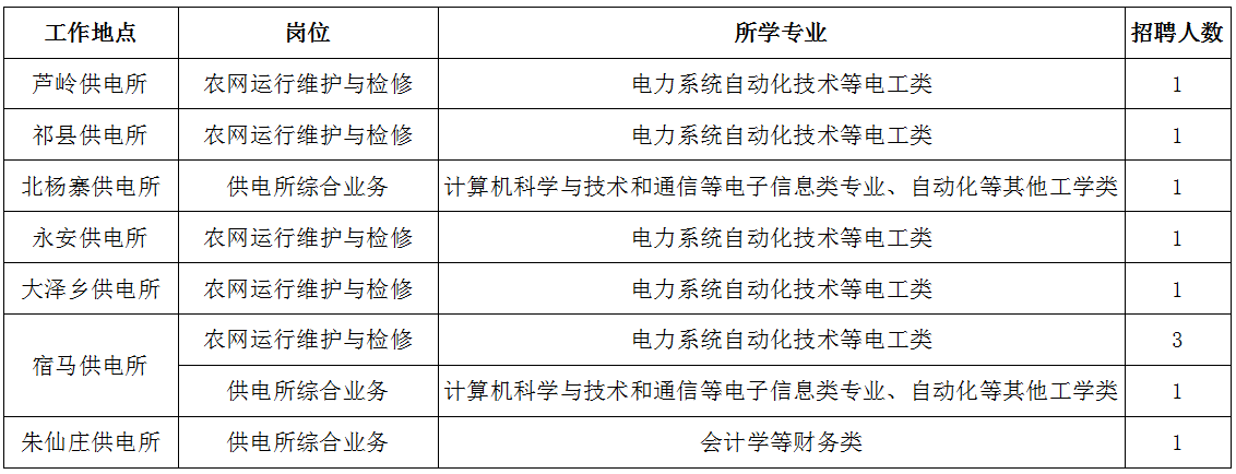 公司计划招聘79人,派驻至乡镇供电所从事农电岗位工作,其中农网运行维护与检修岗位需登杆作业,限招男生。