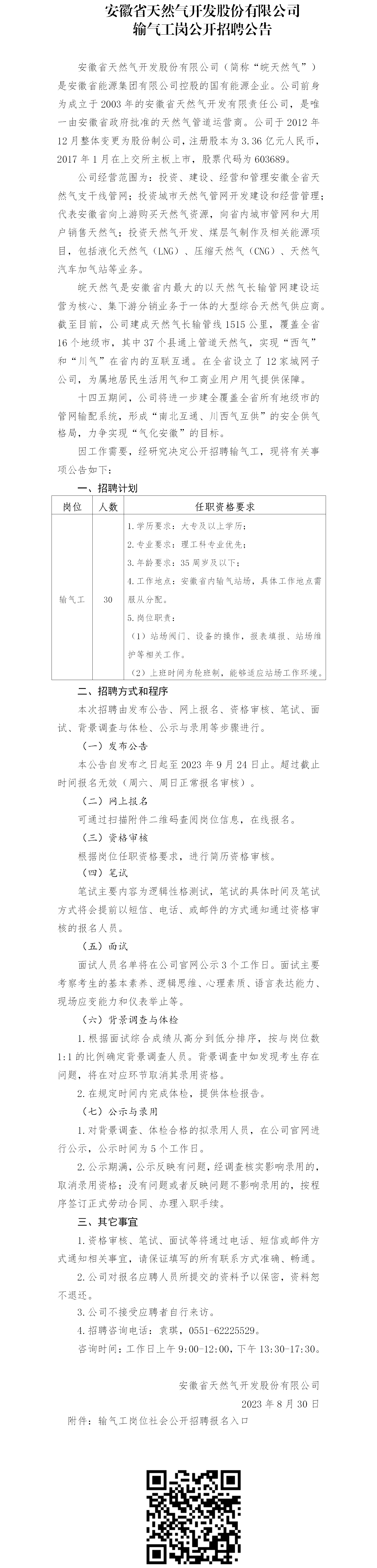 2023年安徽省天然气开发股份有限公司输气工岗公开招聘公告