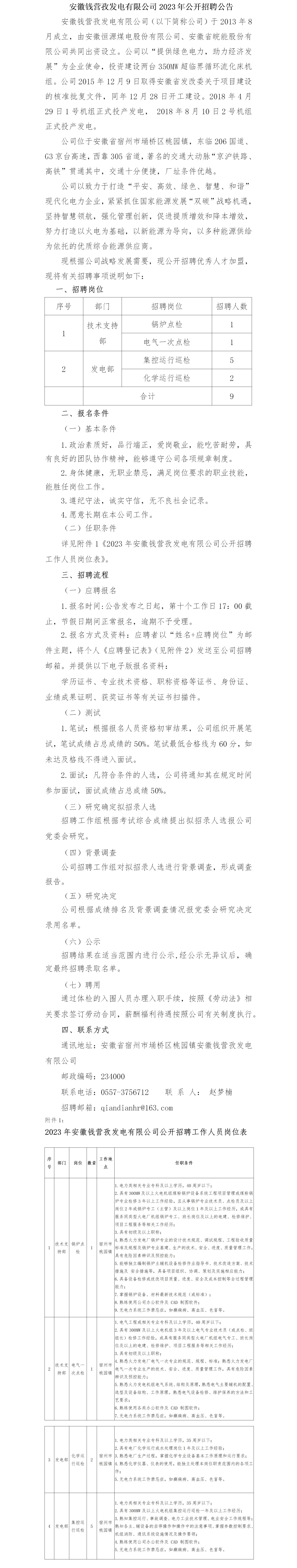 2023年宿州安徽钱营孜发电有限公司公开招聘公告