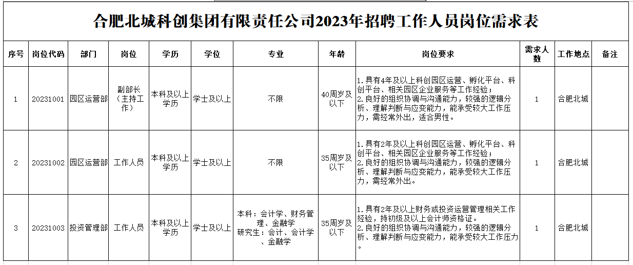 2023-10-18 15:05:28阅读()长丰英才网合肥北城科创集团有限责任公司更名于2023年2月,注册资金2亿元,是长丰县委、县政府投资成立的国有公司。公司主要为增强长丰县科创第一动力,厚植人才第一资源,推动科技成果“三就地”,打造长丰县专业化、生态化“科创+人才”综合服务平台。公司致力于进行科创招商、科创服务,孵化县域科创企业,培育县域高新技术企业、专精特新企业,做好科创服务及人才服务。因工作需要,现面向社会公开招聘工作人员3名,现将有关事项公告如下: