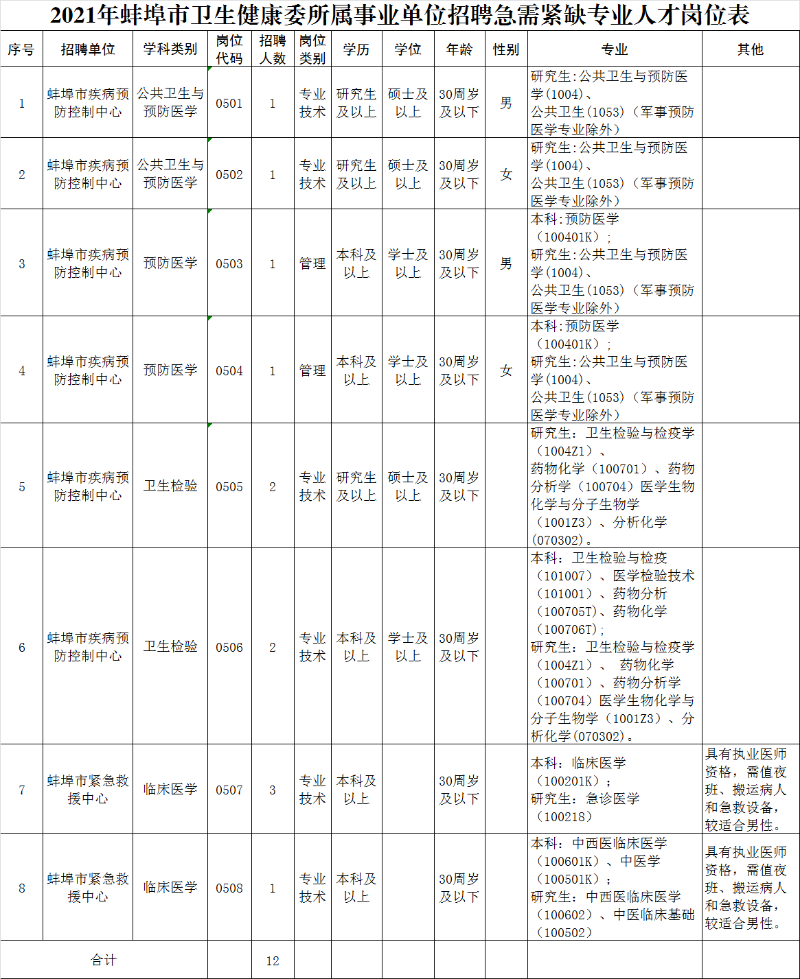 2021年蚌埠市卫生健康委所属事业单位招聘急需紧缺专业人才岗位表
