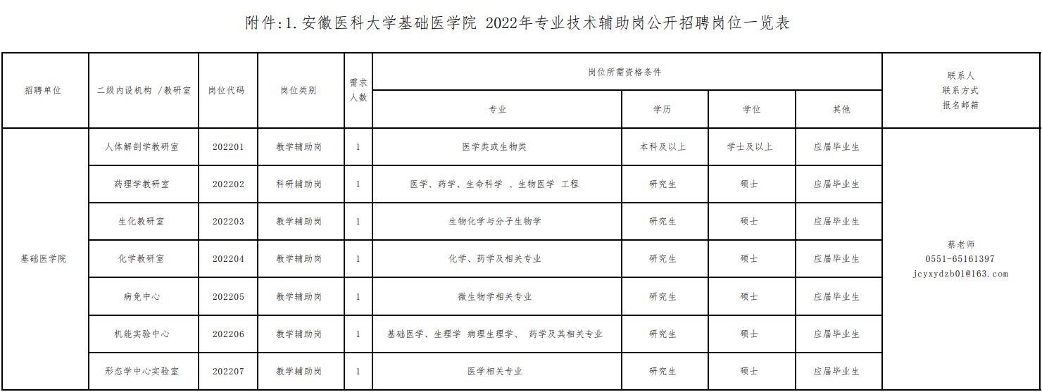 2022年安徽医科大学基础医学院专业技术辅助岗公开招聘岗位一览表